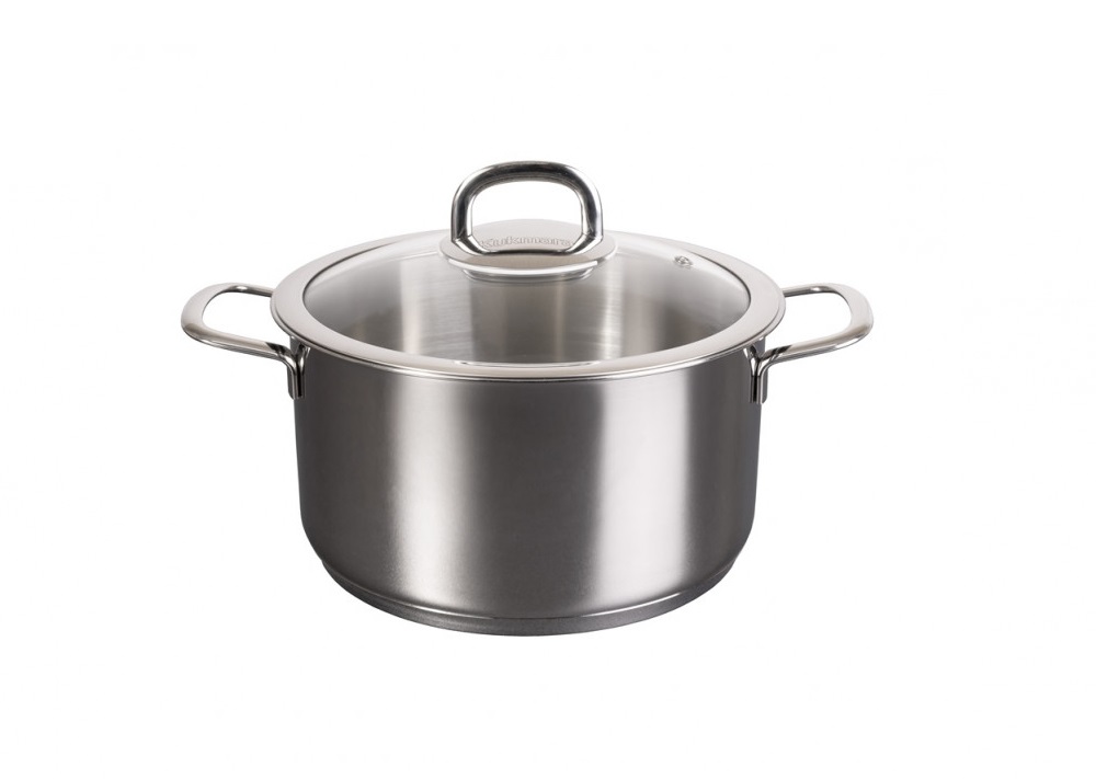 - Имеет плоское, утолщенное дно, состоящее из 3-х слоев металла: индукционного, термоаккумулирующего и проводящего, которое равномерно распределяет тепло и препятствует подгоранию пищи. Это позволяет использовать посуду на любых видах плит, в том числе индукционных и стеклокерамических
