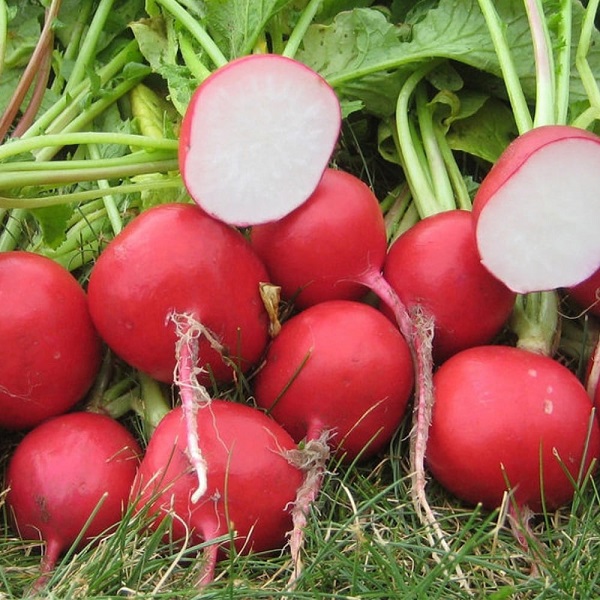 - Корнеплоды крупные (до 3 см в диаметре), округлой и округло-овальной формы, с гладкой кожицей ярко-красного цвета, средней массой 20-25 грамм. Мякоть белая, плотная, сочная, полуострого вкуса